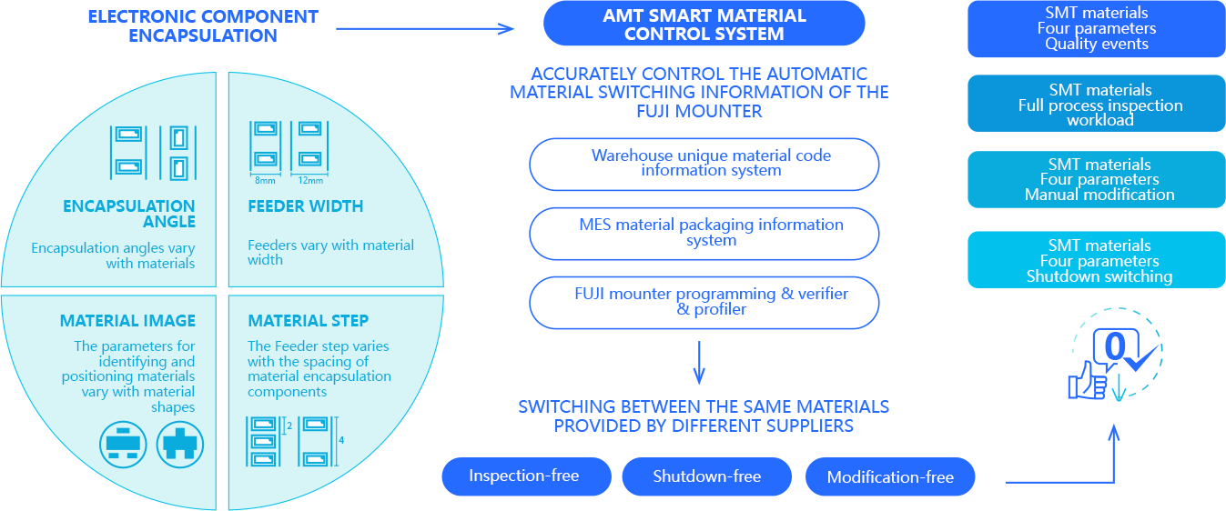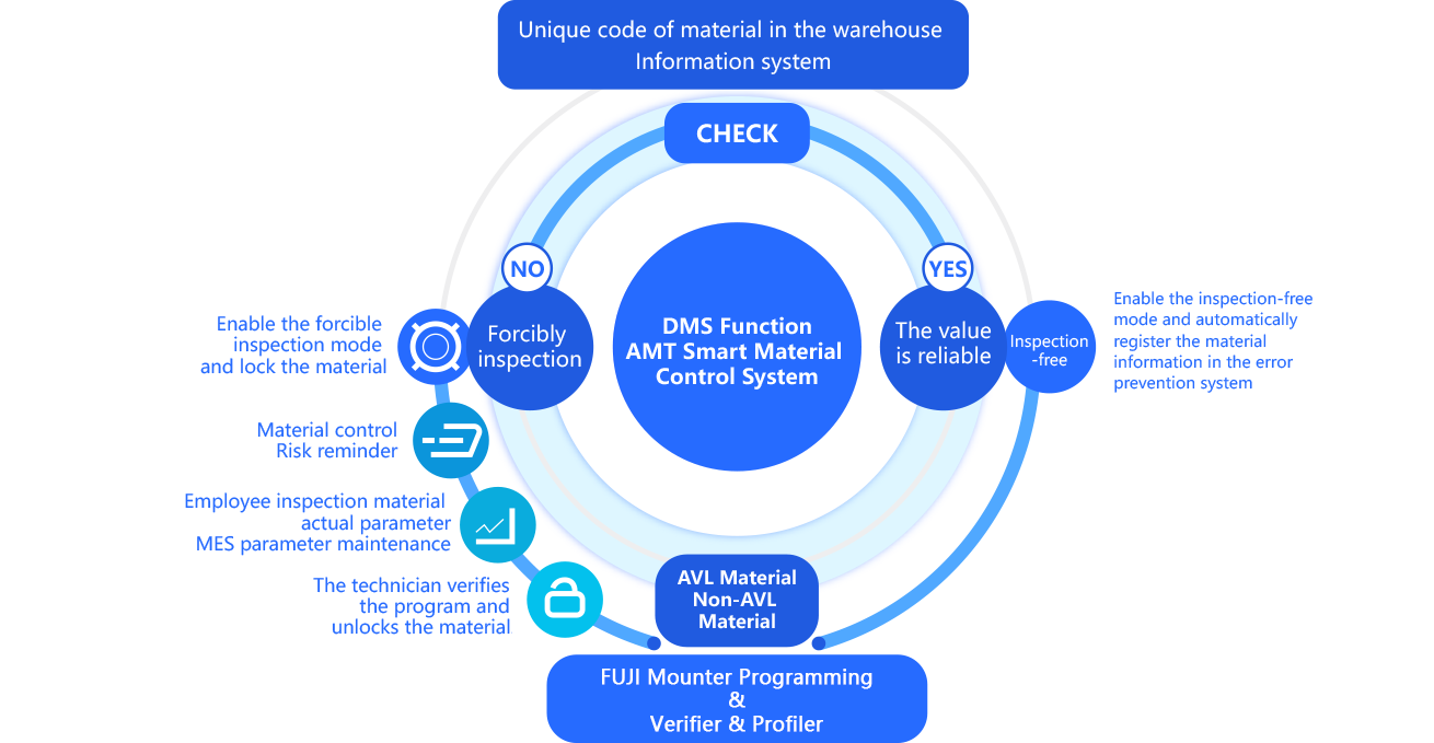 The AMT Smart Material Control System integrates the MES material packaging information system, warehouse unique material code information system, and SMT programming & material scanning system.